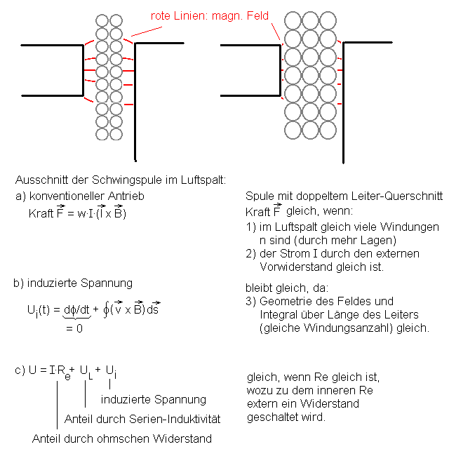 Wo sind die Vorteile: 1) die interne Spule wird nur noch halb so heiß, da nur die halbe Leistung umgesetzt wird 2) der externe Widerstand kann groß sein, so dass er nie heiß wird 3) der externe Widerstand ist aus einem Material, das kaum temperaturabhängig ist (das sich aber für die Schwingspule selbst nicht eignet) 4) höhere Haltbarkeit des Tieftöners durch geringere thermische Belastung