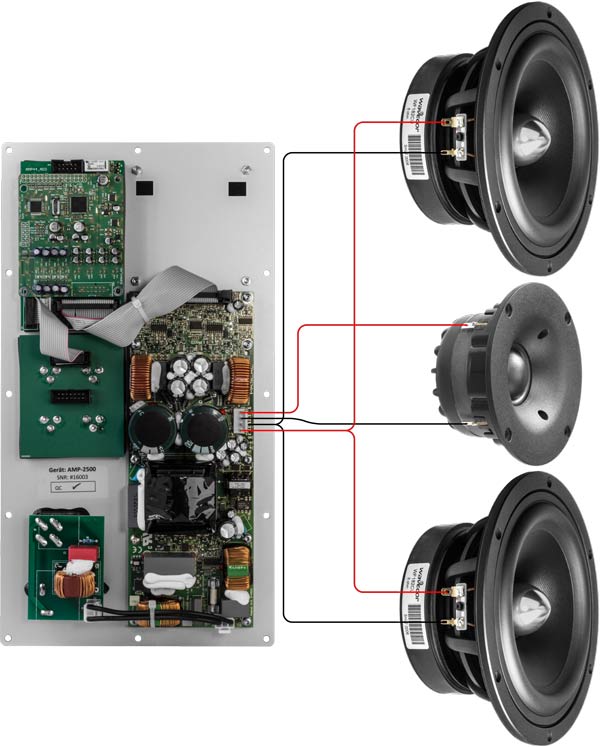 In High-End-Anwendungen, bei denen Verstärker und Lautsprecher eine Einheit bilden, kann auch pro Lautsprecher ein audaphon AMP-2500 verwendet werden. Dazu können die eingebauten Verstärker gebrückt werden. Beim Anschluss im Brückenbetrieb sind ein paar Details zu beachten, die in der Bedienungsanleitung detailliert beschrieben sind.