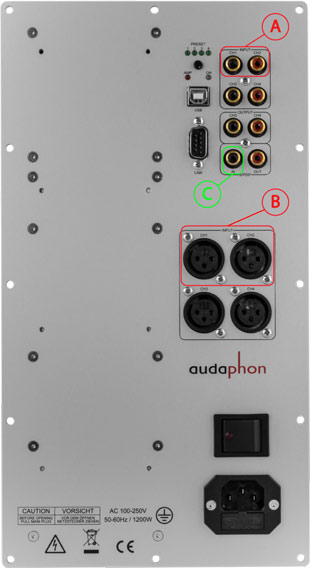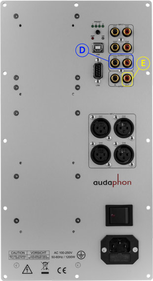 Kanal 3 und 4 sind für externe Geräte als analoge Ausgänge (D) herausgeführt. Außerdem gibt es einen digitalen Ausgang (E), der nicht durch den DSP gefiltert wird und das Signal vom digitalen Eingang weiter gibt.