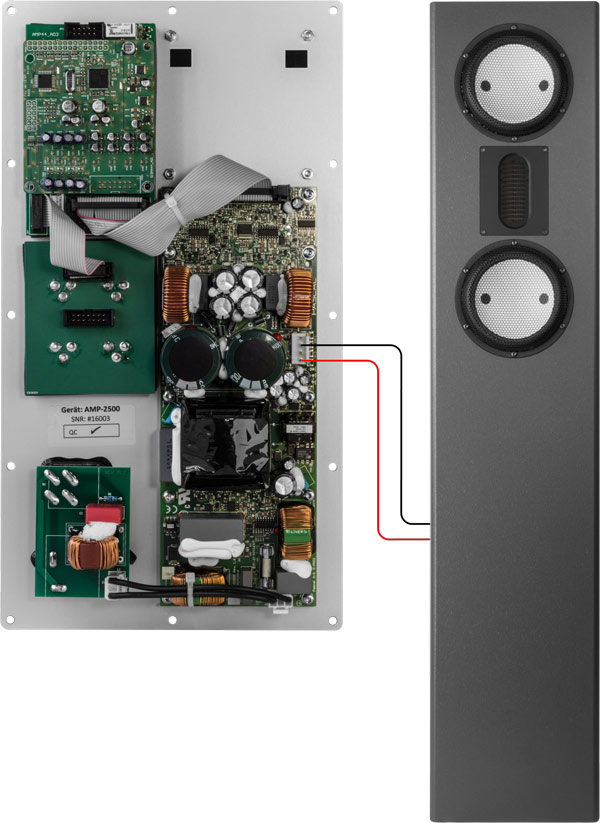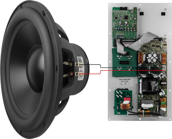 In der Abbildung auf der linken Seite kann man die Rückseite vom audaphon AMP-2500 mit der Verstärkerplatine und den Chassisanschlüssen sehen. Es können zwei Chassis an den Verstärker angeschlossen werden oder man kann im Brückenbetrieb nur ein Chassis an den Verstärker anschließen.
