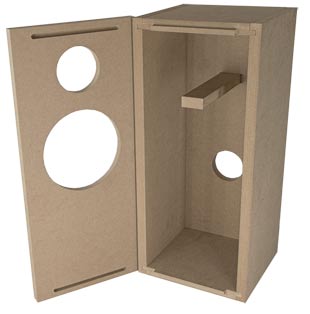 Vergrößern  Lautsprecherbau ist ein tolles Hobby und es ist ein großartiges Gefühl, wenn der erste Ton aus dem Lautsprecher kommt. Der Weg zum selbstgebauten Lautsprecher wird jetzt noch einfacher. Dies wurde mit einem Konzept aus der PA-Technik verwirklicht. Dabei werden die Einzelteile vom Lautsprecher mit Nut und Feder (Spund) gefertigt. Dieses System steigert die Stabilität und vereinfacht den Zusammenbau. Mit dem Gehäuse-Kit kann der Lautsprecher mit wenig Aufwand in der Wohnung gefertigt werden, es fällt weder Schleifstaub noch Bohrspäne an.