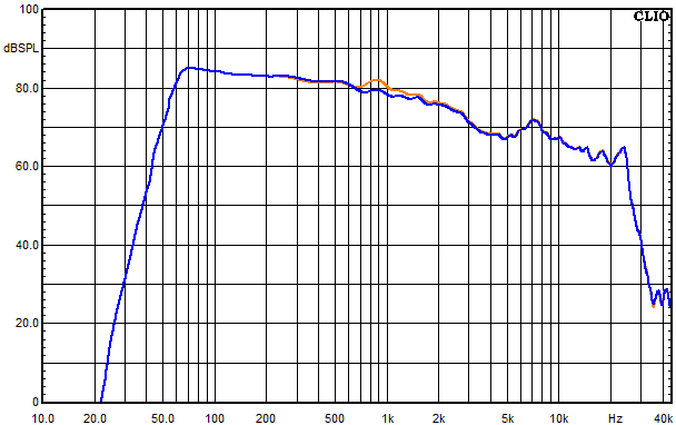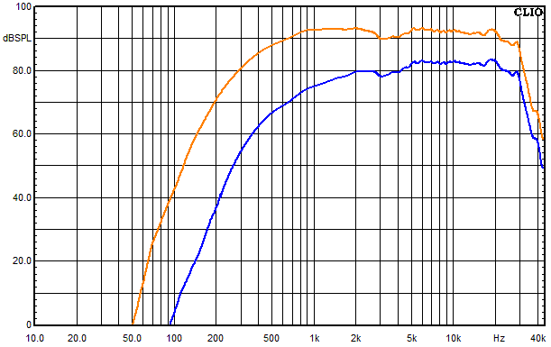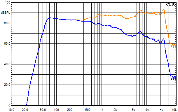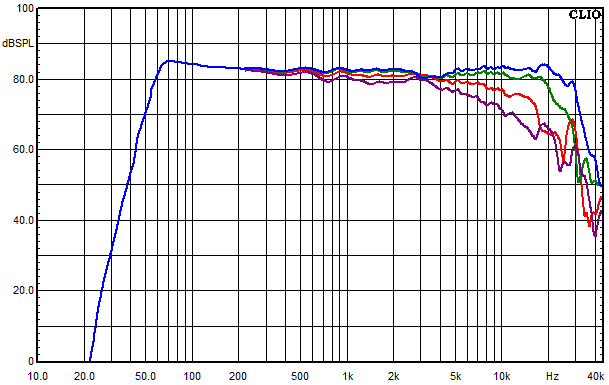 - Blau = Summe aus Hochtöner, Mitteltöner und Tieftöner auf Achse gemessen