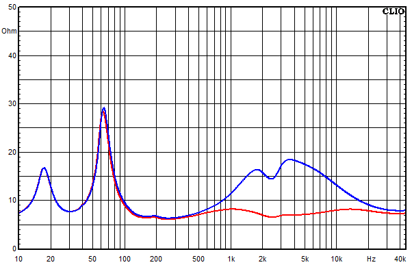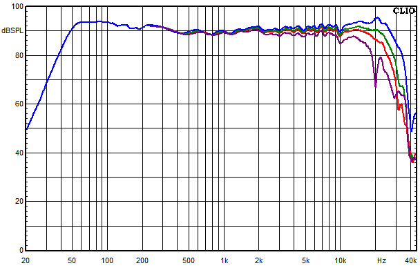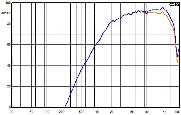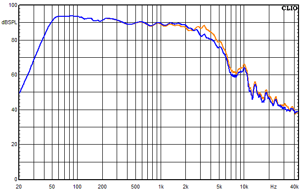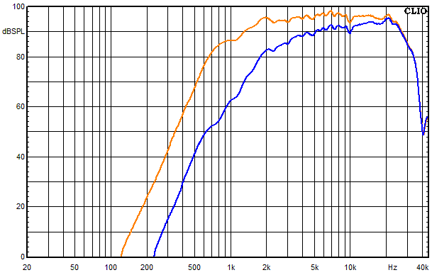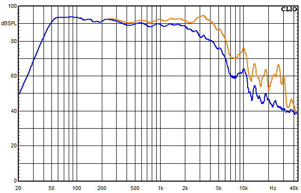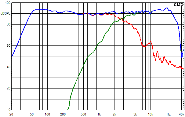 - Blau = Summe aus Hochtöner und Tieftöner auf Achse gemessen