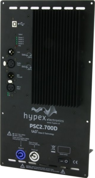 Der PSC2 ist ein Einbaumodul, der in Aktivlautsprechersystemen verwendet wird . Als aktive Lautsprecher-Steuerung kann eine PSC2 die Grundlage für einen leistungsfähige aktive Zwei-Wege-Monitor bilden. Das Modul PSC2 hat zwei 700Watt UcD Module implementiert und ist auch mit einem digitalen Audio-Eingang AES / EBU, als so genannte PSC2.700d Version verfügbar. Die Versorgungsspannung wird von einem Switched Mode Power Supply (SMPS1200)-Modul bereitgestellt, welches auch ein Modul von Hypex Electronics ist. Ein PC steuert die PSC2 über den USB-Port. Diese Verbindung wird verwendet, um die Konfiguration und Filtereinstellungen zu laden. Es ist auch möglich, die Firmware über USB zu aktualisieren.