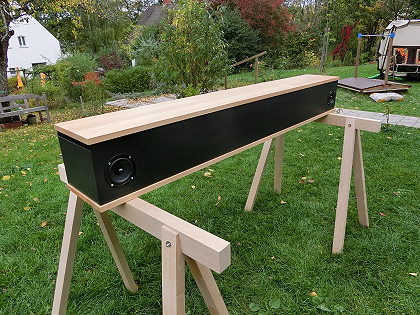 " Beim Contest wurde der Soundbar keinerlei Sonderbehandlung zuteil. Will sagen: sie stand frei im Raum unter den gleichen Voraussetzungen, die alle anderen Boxen auch hatten. Und schlug sich ausgezeichnet: Es klang bestens ausgewogen, dynamisch und knackig. In der Praxis funktioniert das auch bei erstaunlich hohen Pegeln noch gut, die Verzerrungen machen sich erst ziemlich spät störend bemerkbar. Dynamisch steckt die Konstruktion so ziemlich alles in die Tasche, was die Industrie an Fertigprodukten sonst so bereithält. Hier gibt's zwar keine modernen Pseudo-Surround-DSP-Spielereien, aber absolut ernsthaften klassischen Fernsehton. Bei mir wird so ein Riegel demnächst einziehen; ich zeige mal ein paar Bilder, wenn's so weit ist."