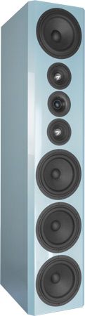 Omikron aktiv is a full active three way floorstanding speaker with seven drivers in a symmetrical arrangement.