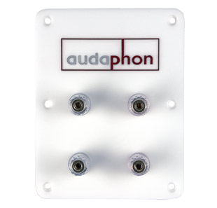 Das neue Audaphon Terminal T1 ist Made in Germany und wird aus hochwertigem Plexiglas gefräst. Es ist weiß und wird bei Hinterleuchtung etwas transparent. Im Lautsprecher eingebaut sieht es jedoch nur weiß aus. Der Schriftzug ist zweifarbig aufgebracht. Das Terminal ist für Bi-Wiring geeignet.