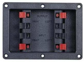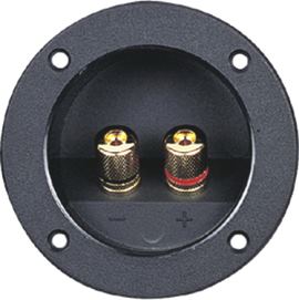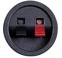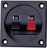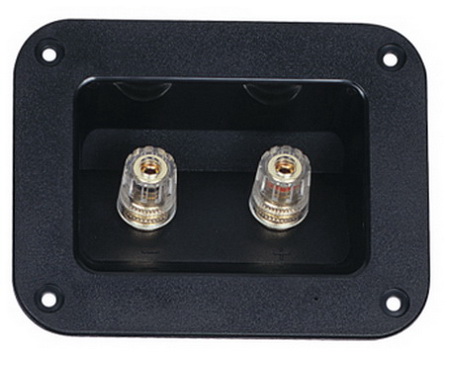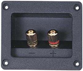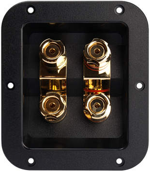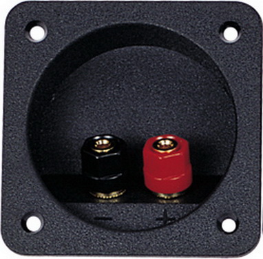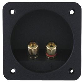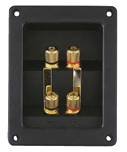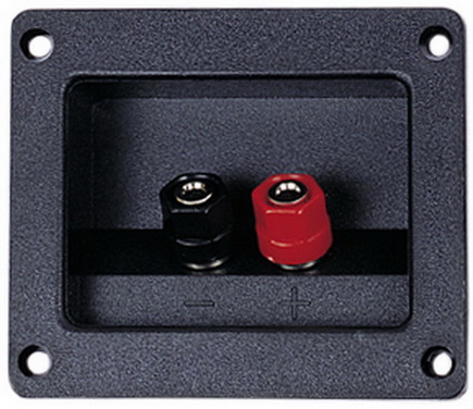 Das rechteckige Terminal wird mit isolierten Klemmen geliefert. Es ist mit einem Dämmstoff versehen, so dass es dicht mit dem Gehäuse abschließt. Das Terminal eignet sich zum Anschließen von Bananenklemmen oder auch zum Klemmen von Lautsprecherkabel bis zu 12 mm2.