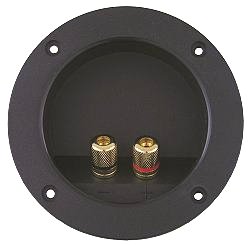 Das rechtwinklige Terminal mit abgerundeten Ecken ist sehr hochwertig. Es ist mit einem Dämmstoff versehen, so dass es dicht mit dem Gehäuse abschließt. Die notwendige Aussparung ist mit der Stichsäge leicht zu erstellen. Das Terminal wird mit isolierten vergoldeten Messingklemmen geliefert. Das Terminal eignet sich zum Anschließen von Bananenklemmen oder auch zum Klemmen von Lautsprecherkabel bis zu 16 mm2. Auf der Innenseite des Terminals können Leiterplatten mit der Frequenzweiche befestigt werden.