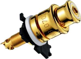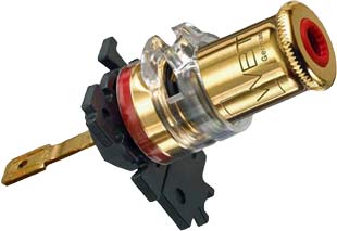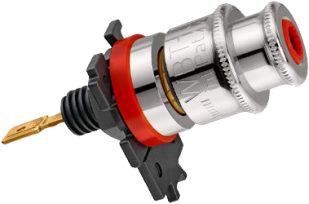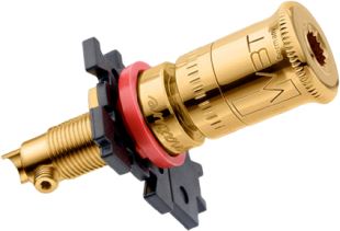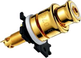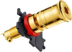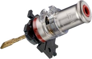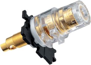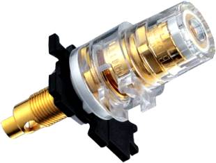 Superb mechanical properties, solid design and the two-piece clamping nut with rotatable pressure piece ensure high contact pressure and hence consistently low transition resistance – the precondition for absolutely minimum effects on sound quality. The elegant design of the pole terminal is further enhanced by shiny gold-plated surface that reliably prevents corrosion. IC and IEC compliance are achieved by transparent full Makrolon insulation of all live parts.