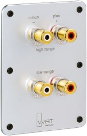 Made to order sizes or laser engraving with, for example a type plate or company logo are available upon request. The plates are suitable for use with all WBT pole terminals. They are ideal for loudspeaker manufacturers or audiophiles who would like to swap their standard pole terminals for WBT terminals. The terminal distances on the bi-wiring mounting plates have been so constructed that the use of the WBT-0725 and WBT-0726 power bridges is possible.