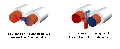 Die Exzellenz Lautsprecherkabel MSR verfügen über die legendäre MSR®-Technologie(Magnetstromreflektor). Basis hierfür ist der sogenannte Proximity-Effekt welcher in benachbarten Leitern eine ungleichmäßige Stromverteilung verursacht. Bei der patentierten MSR® Technologie liegt zwischen den Leitern ein feines Kupferband welches den Proximity-Effekt (auch Nachbarschaft-Effekt oder Effekt der Nähe) der beiden Leiter untereinander reduziert.