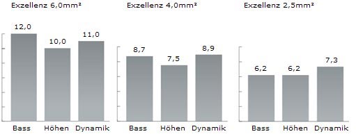 Jedes Kabel hat abhängig von seiner Konstruktion und den verwendeten Materialien einen eigenen Charakter, der sich in der Klangfarbe wiederspiegelt. Das Diagram zeigt welche Klangeigenschaften das Kabel üblicherweise entfaltet und wo seine Stärken liegen. Der angegebene Zahlenwert basiert auf unseren Erfahrungen und Rechenmethoden. Sie ermöglichen den Vergleich verschiedener Produkte und geben eine Hilfestellung bei der Selektion.