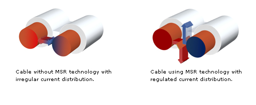 The Excellence speaker cables MSR use the legendary MSR®-technology (magnetic current reflector). The basis for this is the so-called proximity effect in which adjacent conductors cause an uneven distribution of the electric current. Basis of the patented MSR®-technology is a fine copper strip placed between the conductors which reduces the proximity effect of the two conductors.