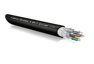 The ViaBlue™ EP-7 Silver Cat 7 cable network has silvered strands of high-purity OFC copper with a braided shielding and 4 aluminium PET film screens for the individual isolation pairs.