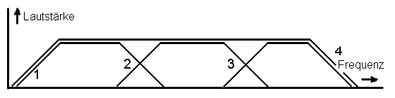 Bild: Idealisierte Frequenzgänge von 1) Tief-, 2) Mittel- und 3)Hochtonlautsprechern. 4) ausgewogener Gesamtfrequenzgang als Summe der Einzelfrequenzgänge.