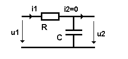 (= Amplituden harmonischer Größen, die komplex sein können,) den einfachsten Tiefpass, bestehend aus Wirkwiderstand R und Kondensator mit der Kapazit"at C. Wir verwenden wieder das Prinzip des Spannungsteilers unter der Voraussetzung, dass I2 = 0 ist. Wir schreiben die Spannungen als komplexe Amplituden, û für Spannung und î für Strom, an mit 1/jωC = j(-1/ωC) = jXC.