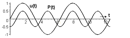 Der Deutlichkeit wegen ist P(t) im Bild gegenüber der Spannung u(t) um π/2 nacheilend. Das ist real dann der Fall, wenn der Strom um π/2 gegen die Spannung nacheilend ist, z.B. an einer verlustlosen oder sehr verlustarmen Spule, wie dies bei dem Klingeltrafo der Fall war.