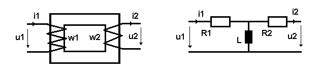 Die längste Zeit des Tages ist die Klingel ohne Inanspruchnahme, d.h. der Trafo arbeitet im Leerlauf mit i2=0; denn so lange kein Klingelknopf betätigt wird, fließt auch kein Strom im Sekundär- also im Klingelstromkreis i2. Wir betrachten diesen Zustand des Leerlaufes. Dafür gilt näherungsweise als elektrisches Ersatzbild, das den Betrieb des leerlaufenden Trafos beschreibt, bestehend aus einer Spule mit der Induktivität L und dem Wicklungswiderstand R1. In dem Augenblick des Klingeldrückens haben wir auch i2 ungleich null. Das nachfolgende Bild zeigt links den prinzipiellen Aufbau eines Klingeltrafos und rechts daneben das einfachste der vielen möglichen elektrischen Ersatzbilder:
